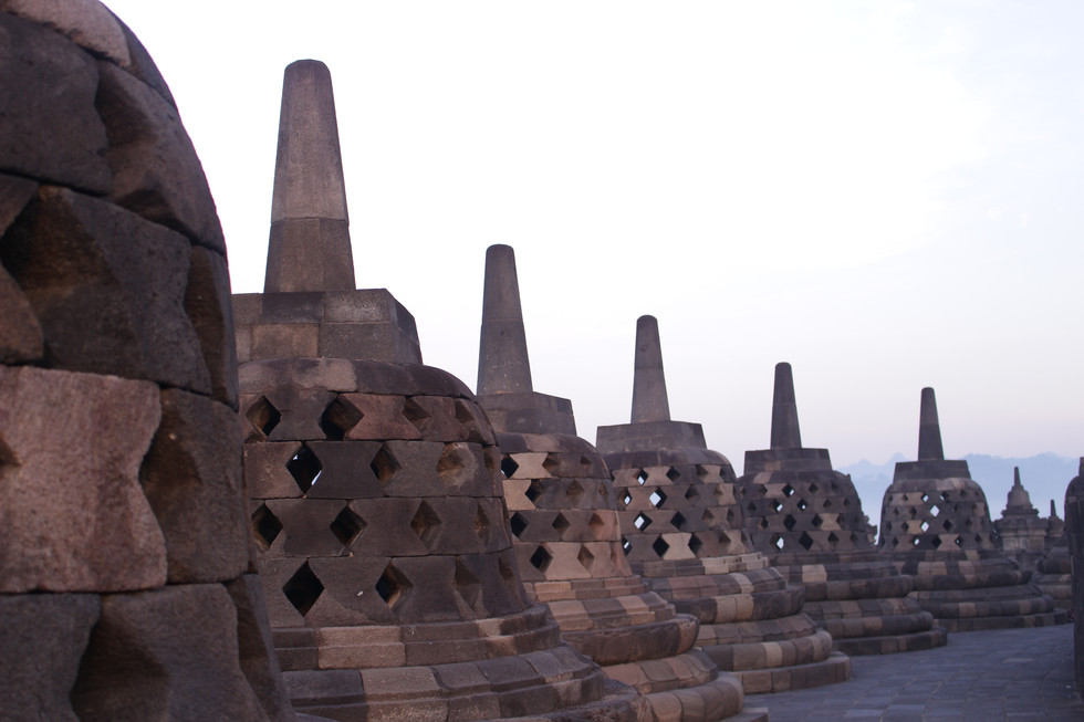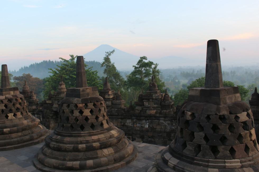 We woke up early morning the next day at around 4 am and viewed the beautiful sunrise at Borobodur amidst the stone sculptures of Buddha and numerous Stupas. I have no words to explain the beauty of the sunrise next to those Stupas overlooking the Merapi volcano, spitting fumes. The golden rays of sun fell over the Buddha statues and Stupas slowly clearing the morning mist and we walked around and explored this really old and big Buddha temple, a UNESCO World Heritage Site.