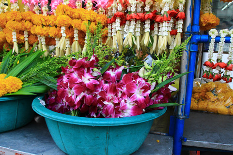 On the next day, we had a long drive from the city to the outskirts and our first destination was the Maeklong Station, which is also known as the 'Dangerous Station'. It is a crowded market place on either sides of a real functioning railway track and the vendors shift their make shift shops as soon as the sirens of approaching train is heard. As soon as the train leaves, the shops are set back and the market is live again! You get to but fresh Thai fruits, veggies, fish and more importantly the beautiful orchid flowers in the market.